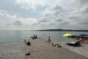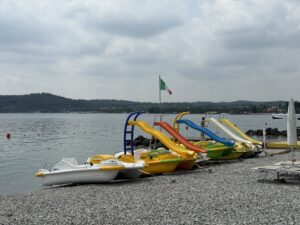 Entlang der Südküste gibt es viele schöne Strandbars, aber Copelia bei Padenghe sul Garda ist einer meiner Favoriten. Warum? Es gibt einen schönen Strand, bunte Stühle auf der Terrasse und man kann dort hervorragend frühstücken und zu Mittag essen. Von Lachsbrötchen bis Pfannkuchen oder Obstsalat, von köstlichem Kuchen bis Pizza oder Croque-Monsieur. Offenbar haben die Italiener kein eigenes Wort für diesen französischen Toast. Wie an vielen Stränden am Gardasee kannst du auch hier Tretboote mieten.